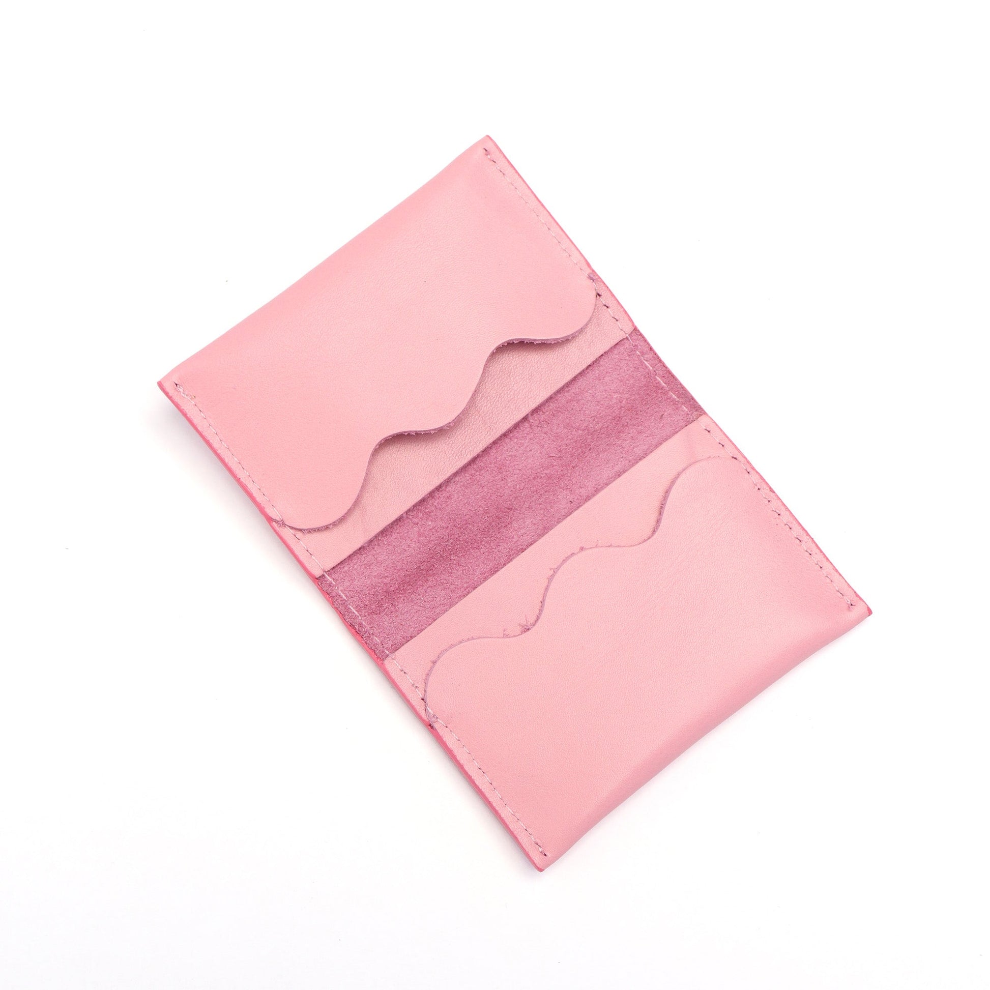 Compact rectangular cow leather cardholder with four card compartments. Wave edge card compartments on either side for cards and folded cash. Leaves enough room to stack several cards.